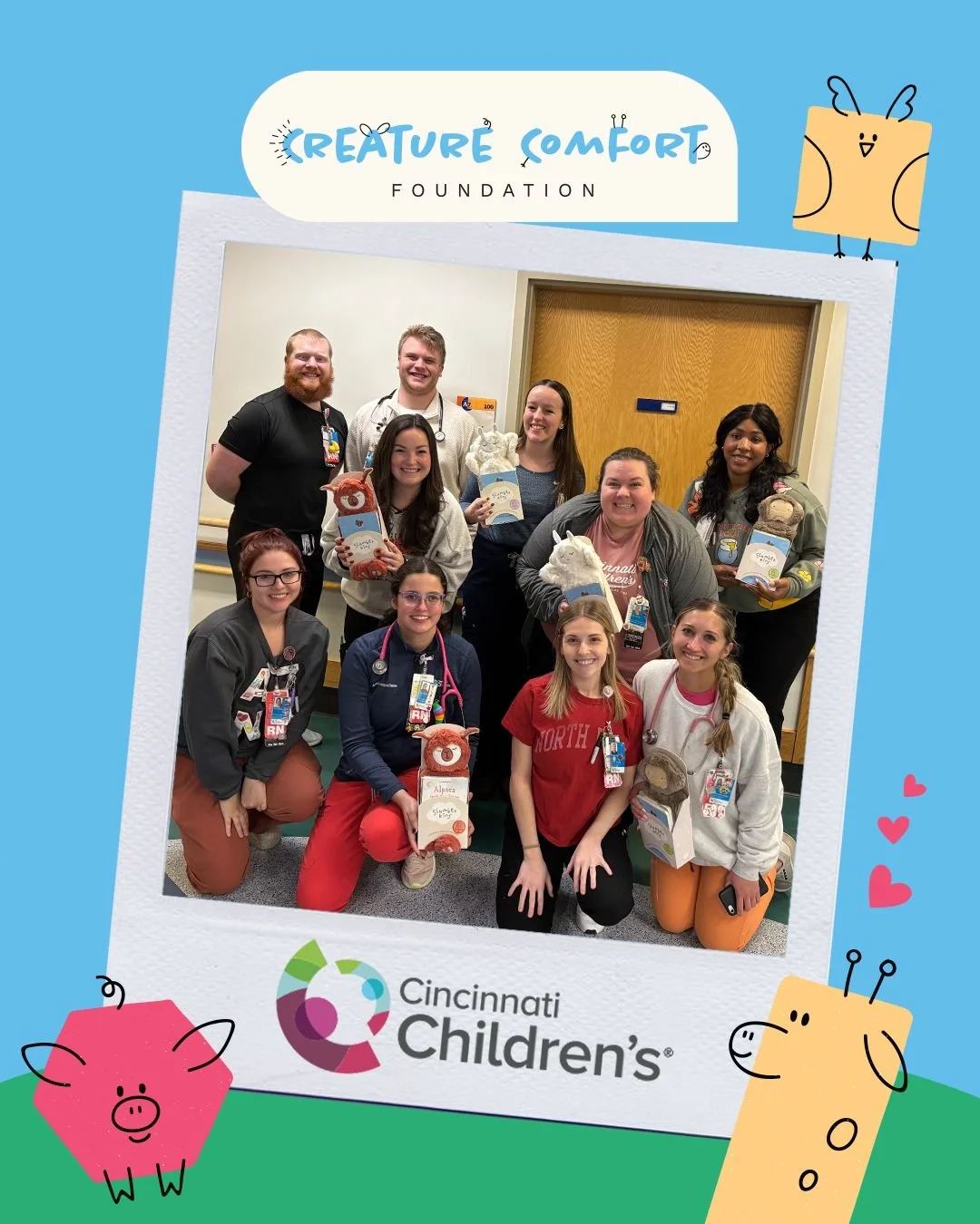 Child life and care team members at Cincinnati Children’s Hospital with donated Slumberkins from Creature Comfort Foundation—providing comfort, emotional support, and moments of joy for pediatric patients, made possible through generous donor support.